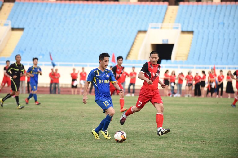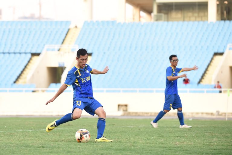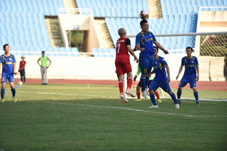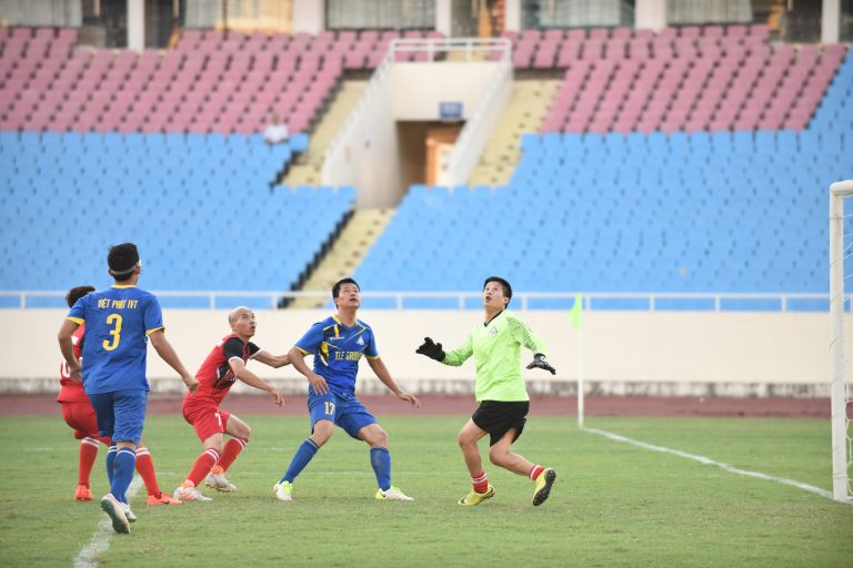 Phút thứ 39 – Tình huống nguy hiểm đầu tiên của Việt Phát – IVT, Lê Minh Sơn (số 8) sút phạt nguy hiểm bên cánh phải, bóng treo cao vào góc xà cầu môn. Rất may cho TLE – HCM khi thủ môn Thăng Long thi đấu tập trung.