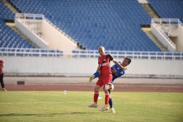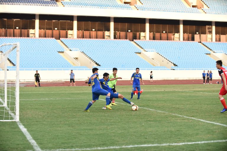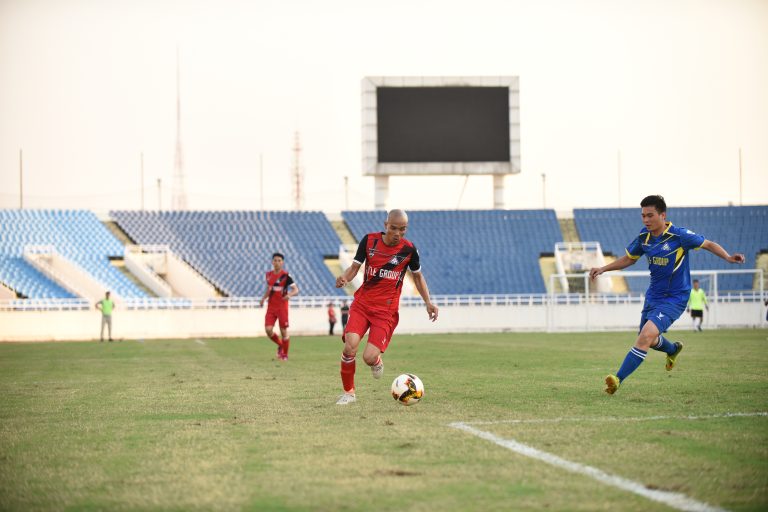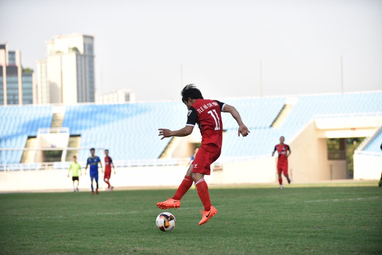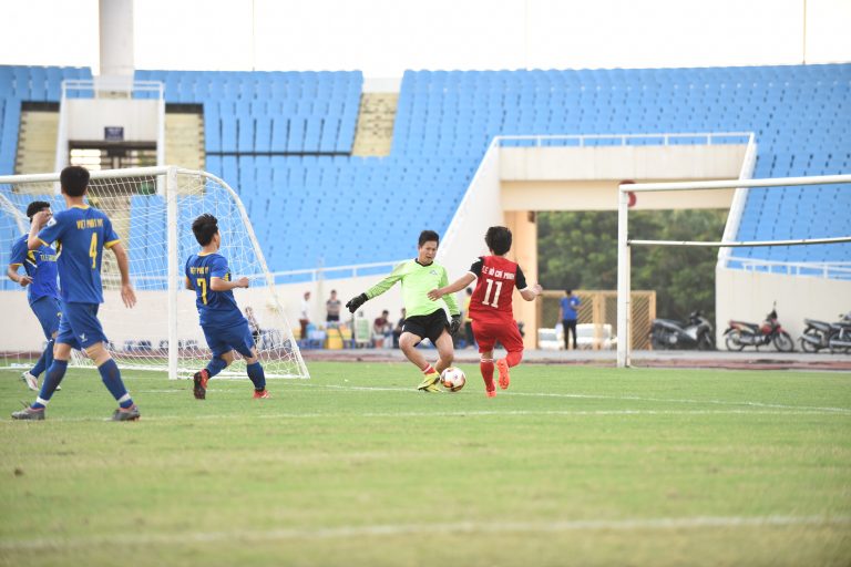 Phút thứ 25, Minh Hiếu (số 7) đi bóng bên cánh trái loại bỏ hàng hậu vệ Việt Phát – IVT pha dứt điểm đi trúng cột dọc
