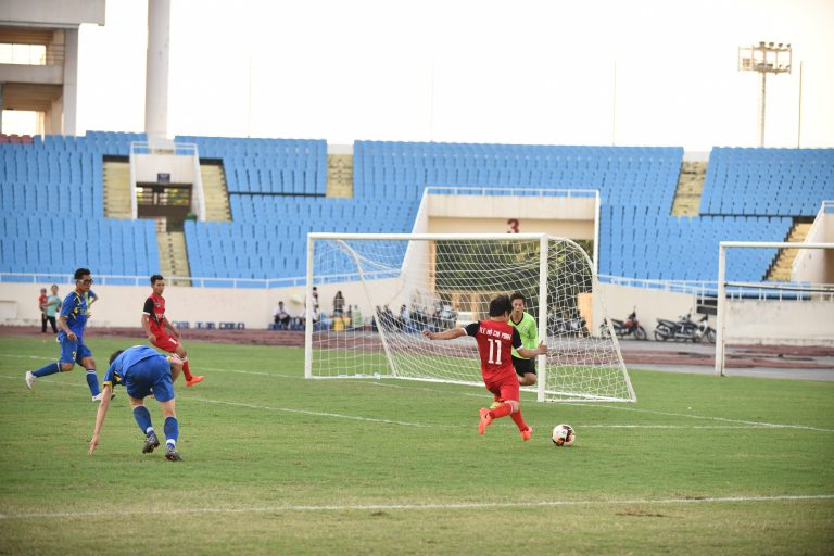 Từ pha lộn xộn trước cầu môn của Ngọc Tân, Thanh Huy (số 17) đã ghi bàn thắng thứ 2 cho đội TLE – HCM